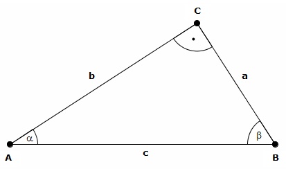 Programmhinweis: Mit Hilfe dieses Programmes kannst Du Deine Fertigkeiten im Umgang mit den trigonometrischen Funktionen Sinus, Cosinus und Tangens überprüfen bzw. verbessern. Vorgegeben werden dabei immer drei Größen in einem rechtwinkligen Dreieck (vgl. dazu die Skizze für ein rechtwinkliges Dreieck mit dem rechten Winkel bei C und bedenke, dass der rechte Winkel im Rahmen der Aufgabenstellungen auch bei A oder B liegen kann). Bestimme dann unter Rückgriff auf geeignete trigonometrische Funktionen die fehlenden Größen! Die Lösungen können durch Klick auf die entsprechende Schaltfläche eingesehen werden - sie werden dabei auf zwei Nachkommastellen gerundet.