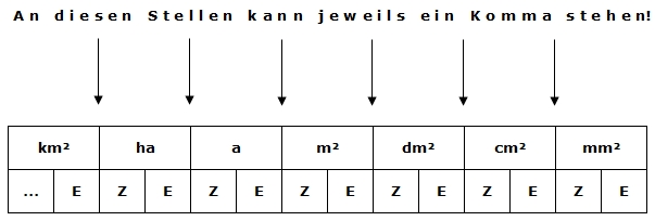 Bei der Umrechnung der vorgegebenen Flächenmaße kannst Du gegebenenfalls die folgende Hilfstabelle nutzen. Insbesondere bei der Umrechnung von