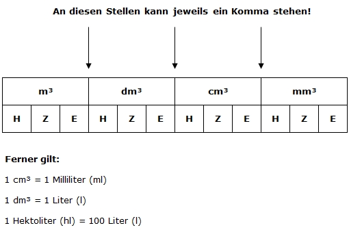 Bei der Umrechnung der vorgegebenen Volumenmaße kannst Du gegebenenfalls die folgende Hilfstabelle nutzen. Insbesondere bei der Umrechnung von