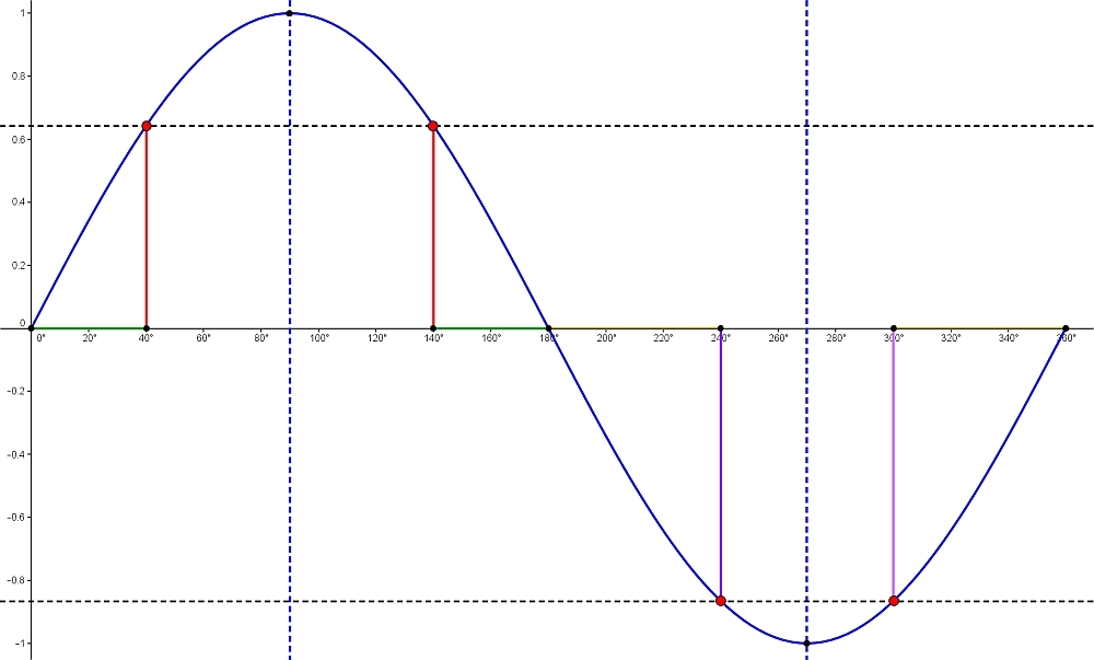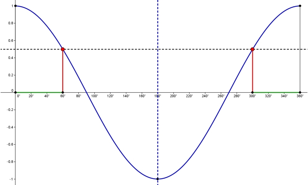 Die folgenden beiden Skizzen verdeutlichen die Vorgehensweise bei der Problemlösung. Nutze geeignete Symmetrie-Eigenschaften des Sinus bzw. des Cosinus über dem Intervall I = [ 0° ; 360° ].