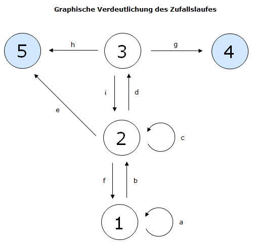 Bedenke schließlich bei der Betrachtung der ebenfalls ausgewerteten Länge eines Zufallslaufes (Minimum, Maximum und Durchschnitt), dass der Start im Zustand 1 nicht als Schritt gilt: der Lauf 1-2-3-2-5 hat also zum Beispiel die Länge 4.