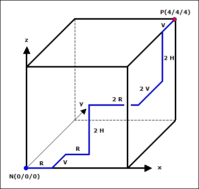 Ein Roboter kenne allein die Laufrichtungen RECHTS, VOR und HOCH (vgl. Skizze), er bewege sich den Gesetzen des Zufalls folgend vom Punkt N(0/0/0) aus von Gitterpunkt zu Gitterpunkt durch das dreidimensionale Koordinatensystem. Ausgewertet werden diverse Ereignisse, die bei einem Lauf aus genau 12 Schritten denkbar sind. Der Benutzer kann wählen, ob ein vollständiges Protokoll der Simulation (R = RECHTS, V = VOR und H = HOCH) angelegt oder aber lediglich das numerische Endergebnis ausgewiesen wird. Für sehr große n kann es im Falle der vollständigen Protokoll-Anzeige zu Browserverzögerungen kommen!