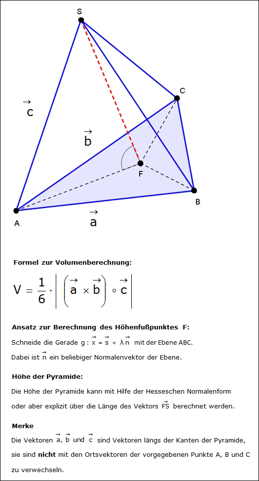 Drei Punkte A, B und C im Raum, die nicht auf einer Geraden liegen, bestimmen zusammen mit dem Punkt S, wenn dieser nicht in der von A, B und C aufgespannten Ebene E liegt, eine Pyramide mit dreieckiger Grundfläche (vgl. Skizze).